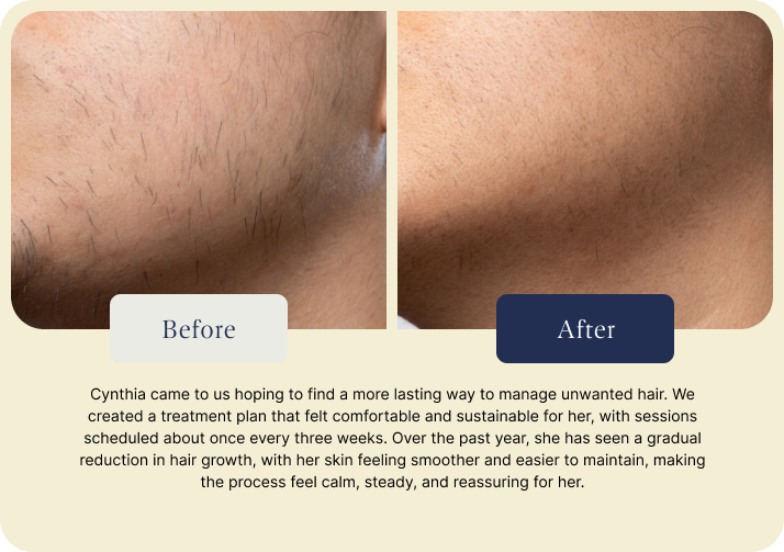 For hair growth caused by hormonal imbalances or PCOS, we create a consistent treatment plan designed to reduce and manage growth effectively over time.