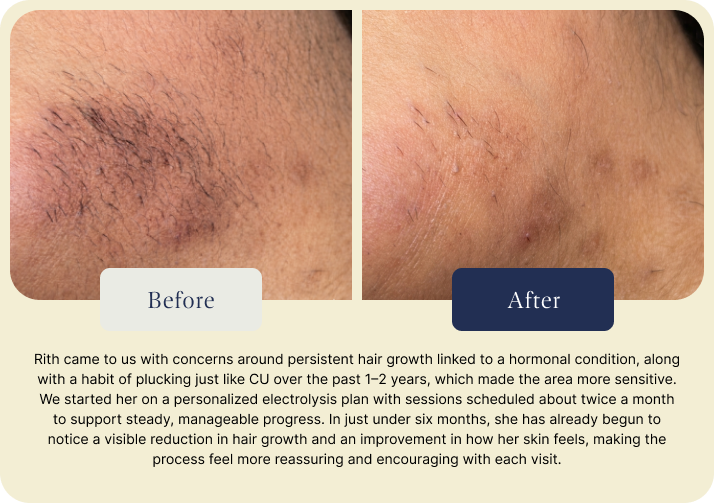Yes. Electrolysis is one of the most effective treatments for PCOS-related facial hair and hormonal hair growth. Unlike lasers, which depend on pigment, electrolysis treats each follicle individually, making it ideal for persistent or hormone-driven hair growth patterns.